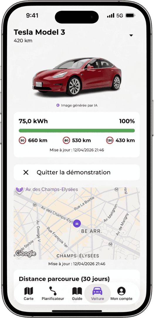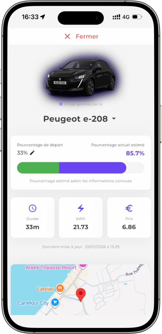 Indiquez votre destination et votre véhicule. Electus vous indique où charger, la durée et le coût de votre recharge.